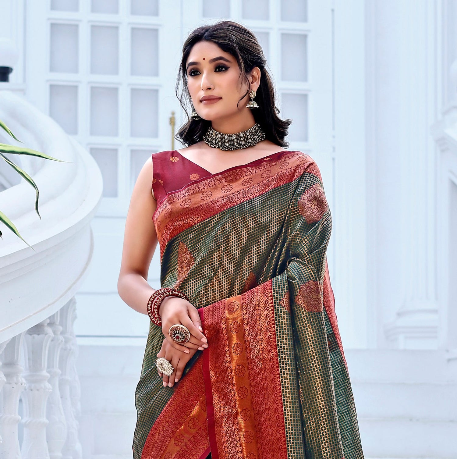 Sophisticated Style Mehendi Green and Coral Silk Saree with Intricate Zari Work