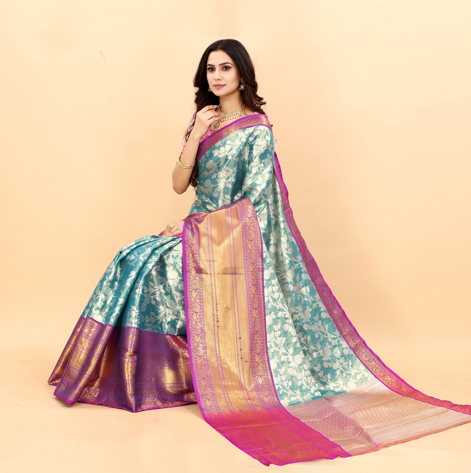 Explore the timeless allure of our Evergreen Kanjeevaram Sarees, renowned for their rich silk texture and intricate gold zari work. Elevate your wardrobe with these classic sarees, perfect for every celebration and cherished occasions.