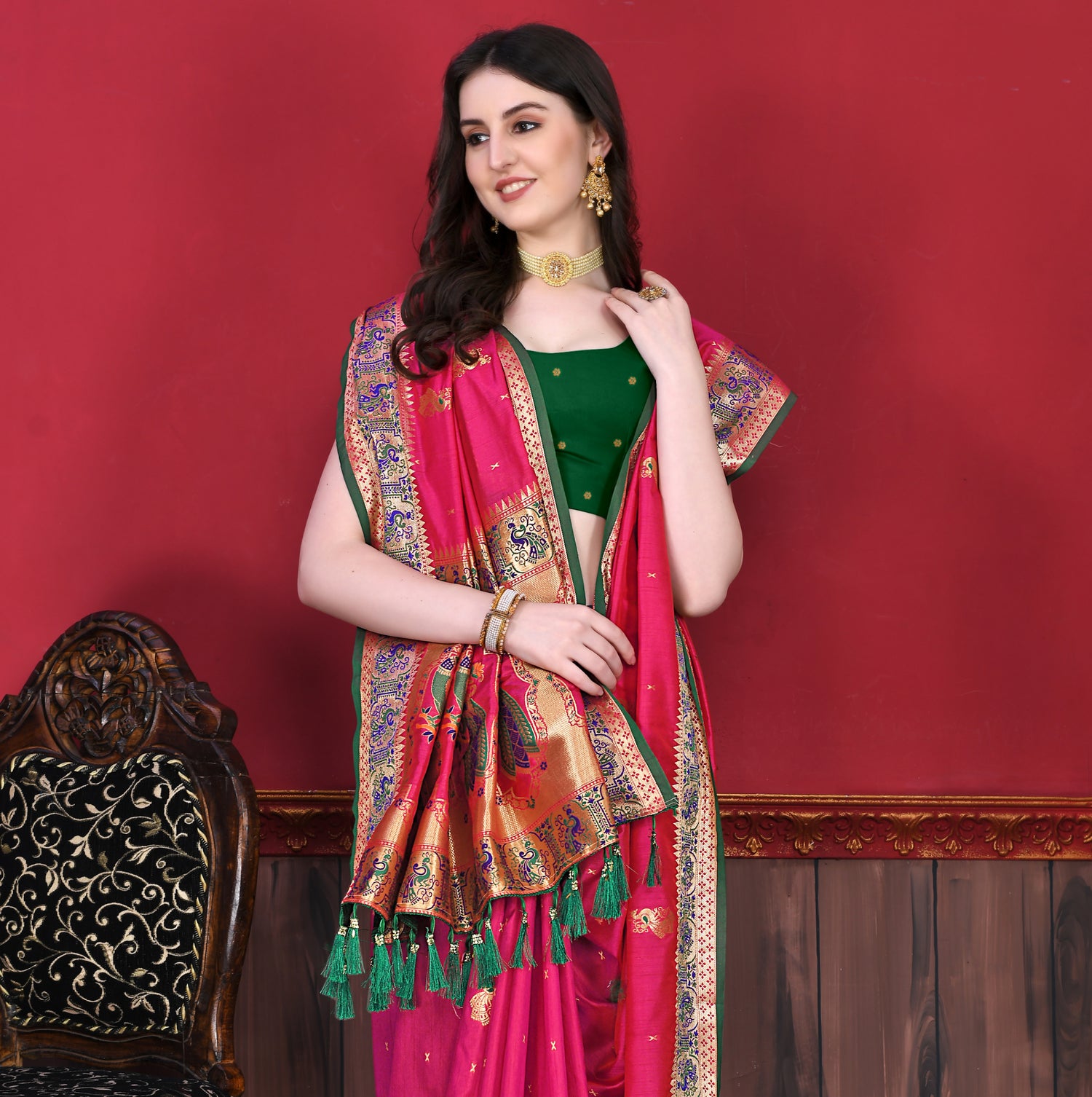 Pink Color Zari Woven Soft Paithani Silk Sarees With Rich Weaving Pallu with tassels.
