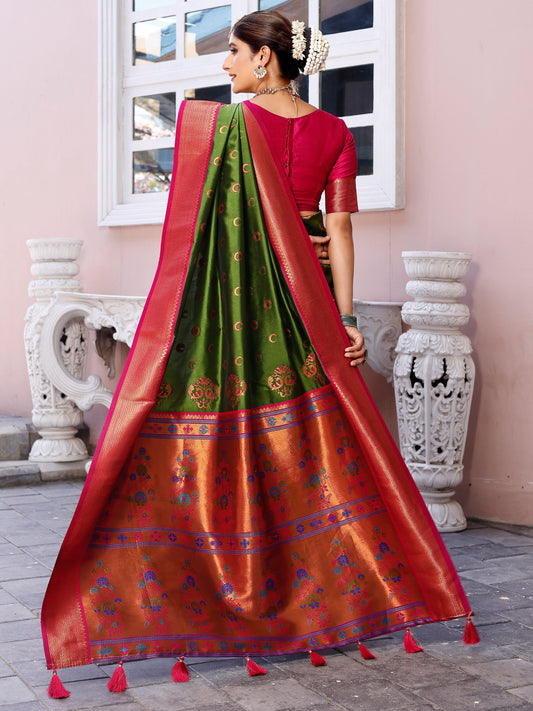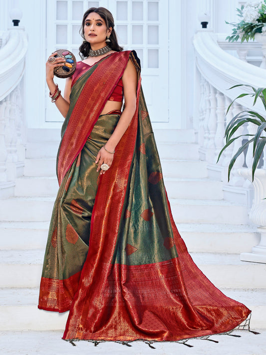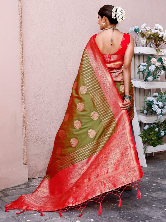 Sophisticated Style Mehendi Green and Coral Silk Saree with Intricate Zari Work