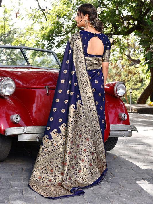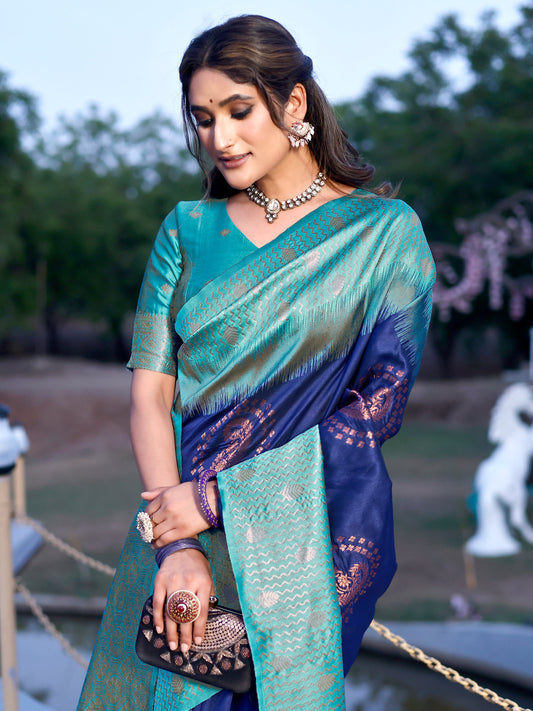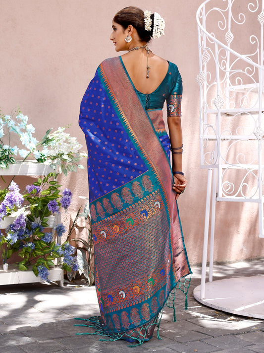 Grandeur Royal Blue and Coral Silk Saree with Intricate Zari Work