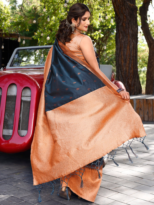 Majestic Magnificence Navy Blue and Coral Silk Saree with Intricate Zari Work