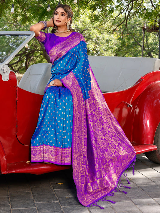Chic Rama Blue and Coral Silk Saree with Intricate Zari Work