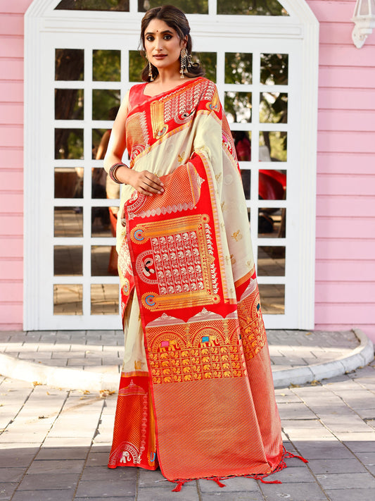 Supreme Off White and Coral Silk Saree with Intricate Zari Work