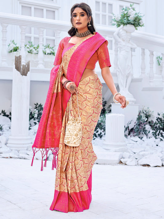 Splendid Cream Beige and Coral Silk Saree with Intricate Zari Work