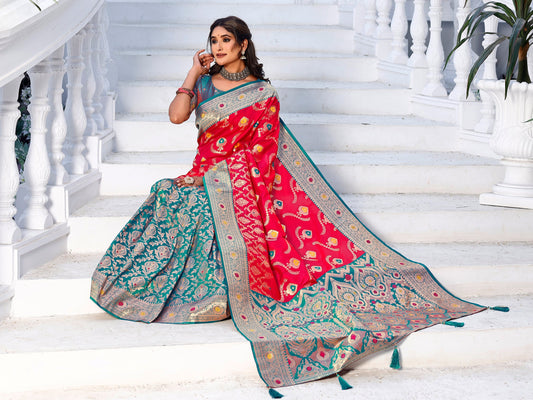 Exquisite Blue and Coral Silk Saree with Intricate Zari Work