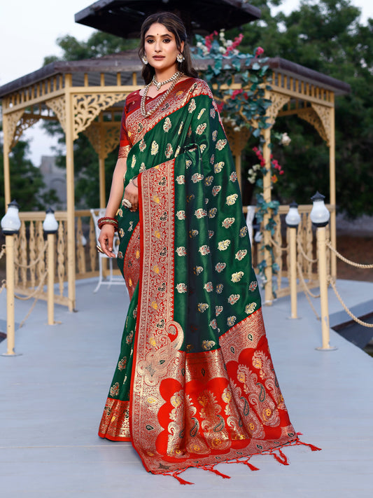 Regality Hunter Green and Coral Silk Saree with Intricate Zari Work