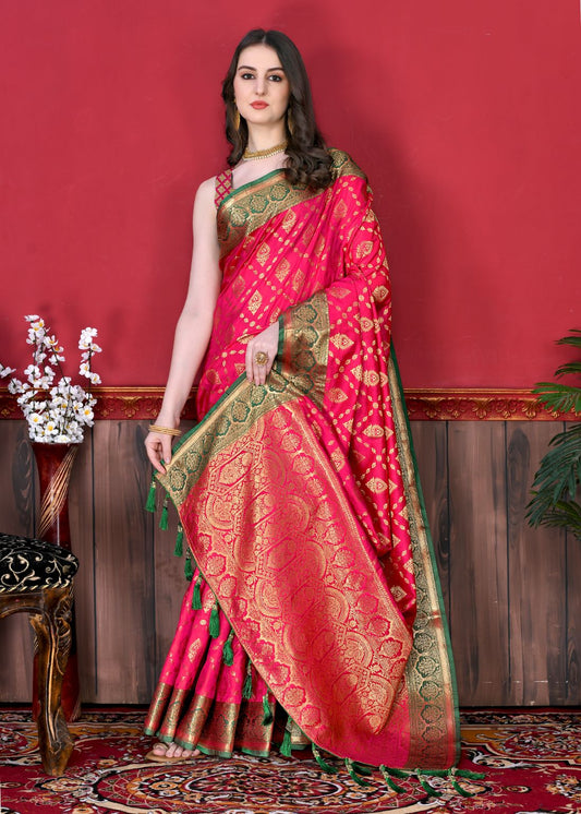 Black & Red Color Women's Soft Bandhani Printed Patola Silk meenakari weawing motifs with Rich Zari Pallu and contrast border with Tessels.