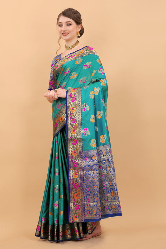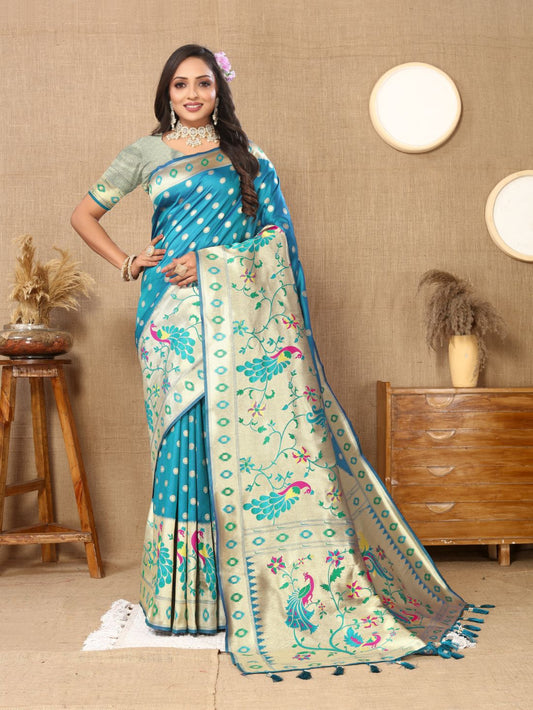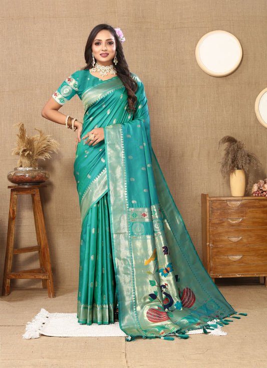 Aqua Blue Color Zari Woven Soft Paithani Silk Sarees With Rich Weaving Pallu with tassels.