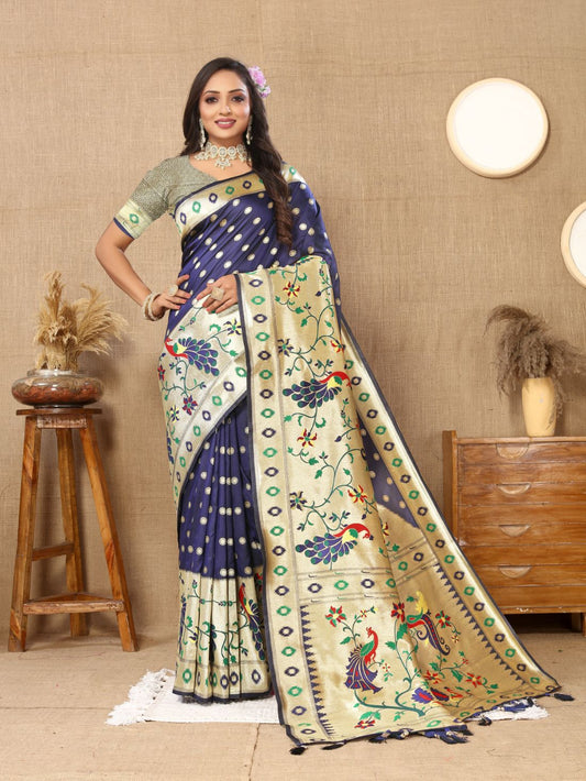 Nevy Blue Color Golden Zari Woven Soft Paithani Silk Sarees With Rich Weaving Pallu with tassels.