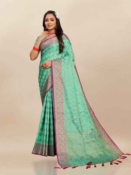 Aqua Blue Color Exclusive Soft Silk Zari Woven Work With Rich Pallu and Contrast Border With Tessels Women's Saree with Unstiched Blouse Pieces.