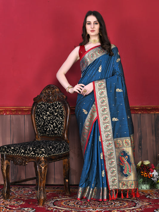 Royal Blue Color Zari Woven Soft Paithani Silk Sarees With Rich Weaving Pallu with tassels.