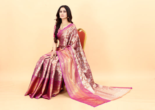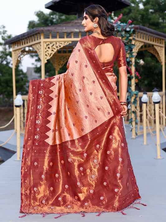 Opulence Crepe Maroon and Coral Silk Saree with Intricate Zari Work