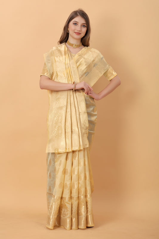 Golden Color Women’s Rich Golden Zari Woven Soft Organza Silk Saree with Unstitched Blouse Piece