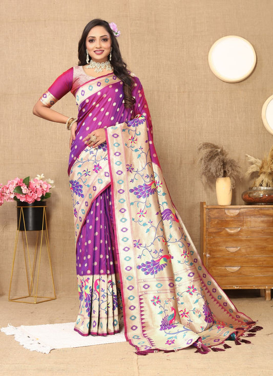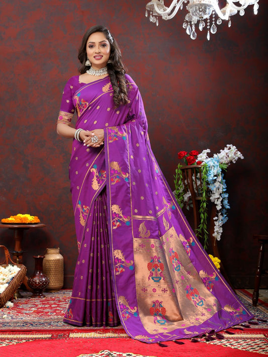 Purple Color Zari Woven Soft Paithani Silk Sarees With Rich Weaving Pallu with tassels.