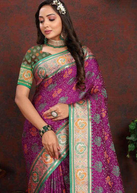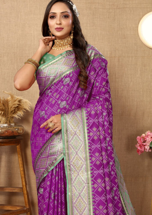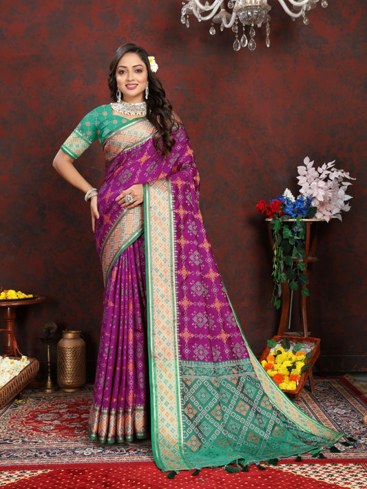 Purple & Green Color Women's Soft Patola Silk meenakari weawing motifs with Rich Zari Pallu and contrast border with Tessels.