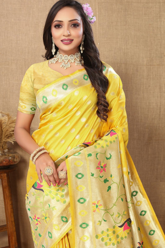Yellow Color Zari Woven Soft Paithani Silk Sarees With Rich Weaving Pallu with tassels.