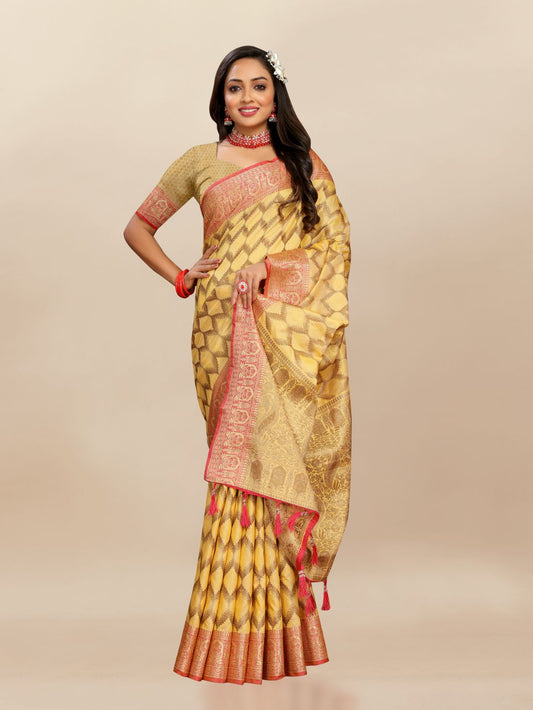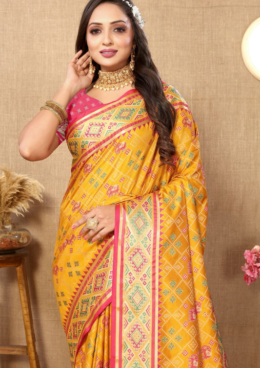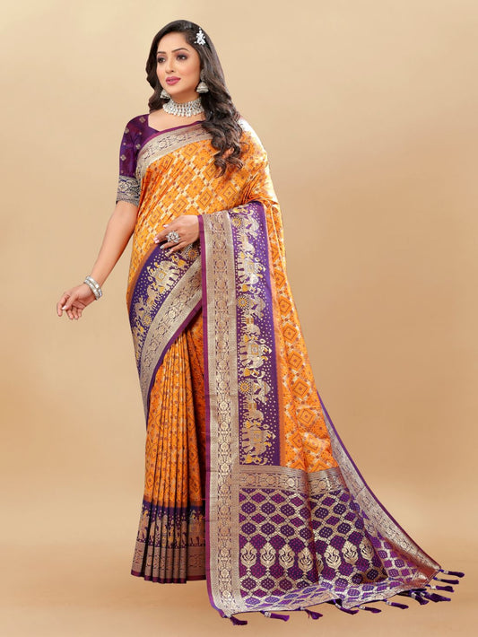 Mustered & Purple Color Women's Soft Bandhani Printed Patola Silk meenakari weawing motifs with Rich Zari Pallu and contrast border with Tessels.