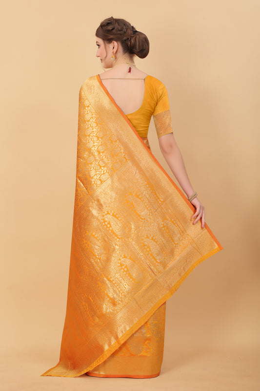 Mustured Color Soft katan silk saree with copper zari weawing design and Rich Zari weawing Pallu with Unstiched Blouse piece.