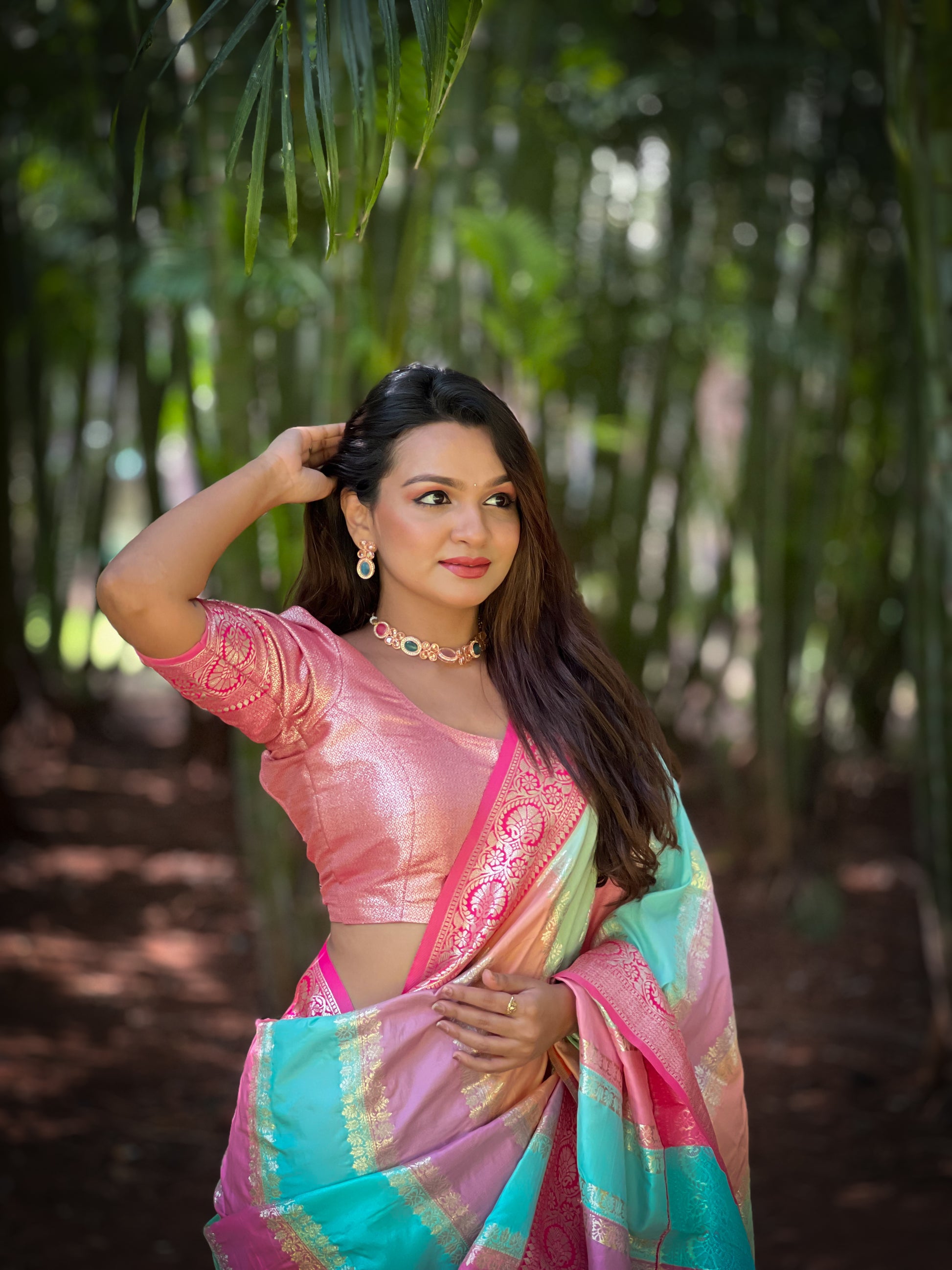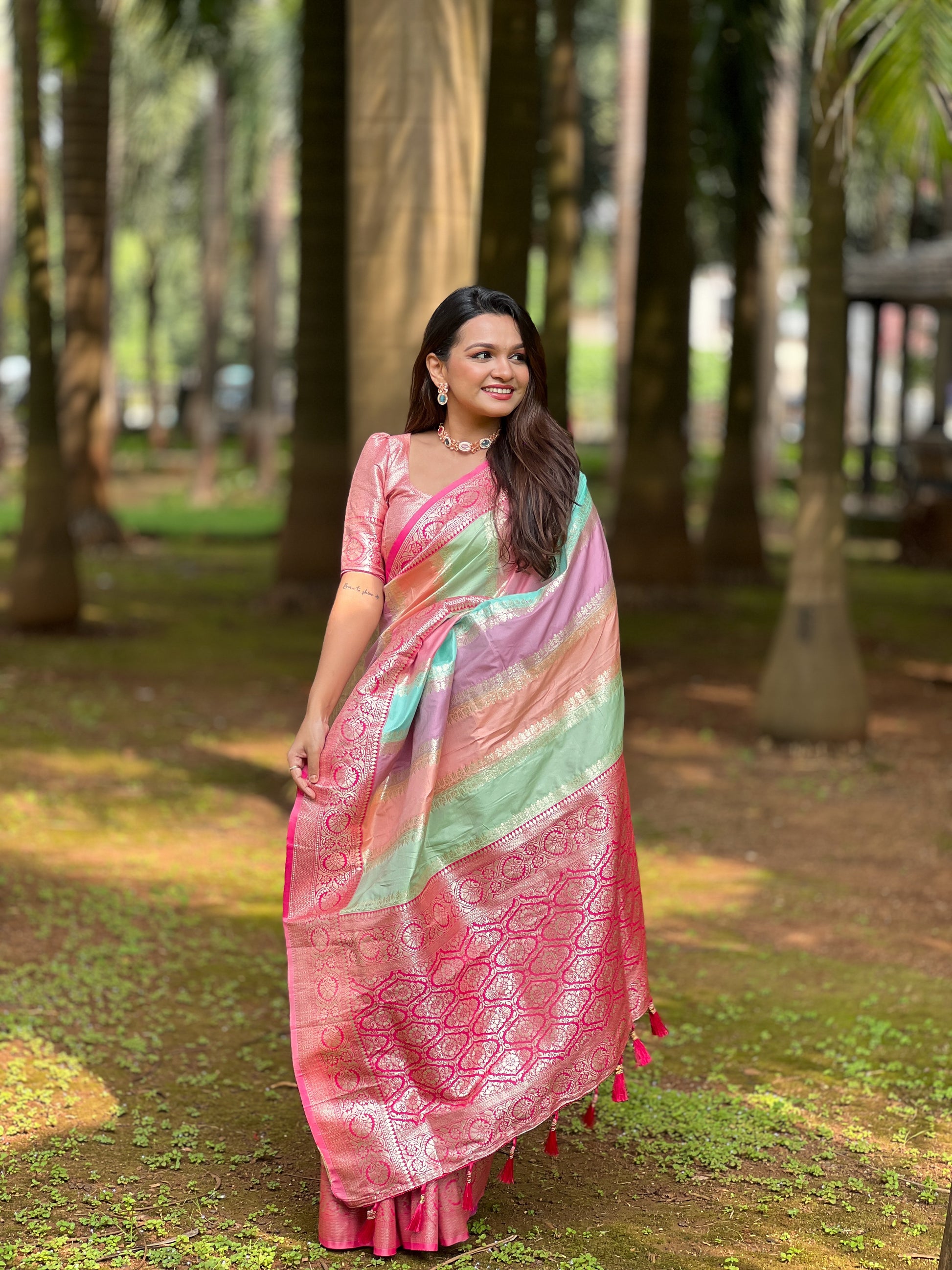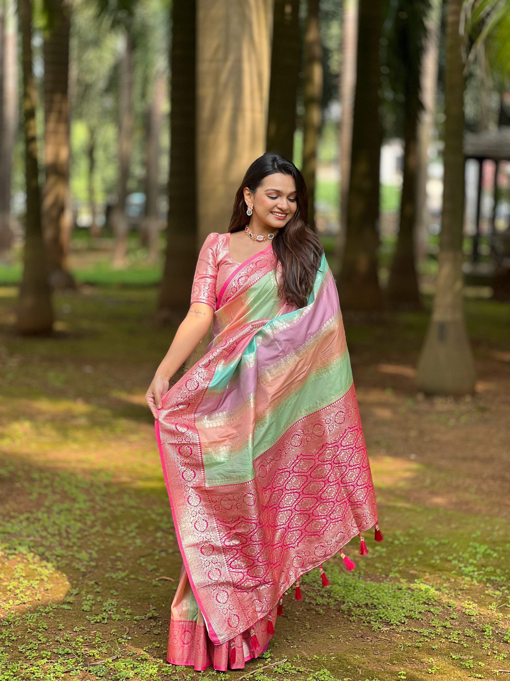 • Soft  silk saree with zari weaving Meenakari  design all over the saree & ZARI weawing contrast  Rich pallu with cotrast weawing border & tessels attached at Pallu End. Blouse :-  Soft silk weawing contrast blouse piece
